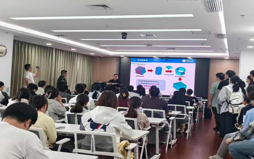 本次报告中,蔡建国教授主要从折纸技术的研究背景,折纸型蜂窝以及折纸工程的应用展开为学子做报告。在报告中,蔡建国教授以工程需求为牵引,围绕蜂窝等轻质耗能材料展开讨论,引入折纸元素提出多种折纸蜂窝材料,同时阐述了压缩荷载作用下不同材料的响应模式、吸能特性与强化机制,对比不同蜂窝力学特性。总的来说,蔡建国教授的折纸技术主要解决了如何利用“折叠”这一简单动作,来创造具有可展开、可变形、多功能和高性能的先进工程结构这一核心科学问题。 他的工作极大地推动了折纸从一门艺术向一门严肃工程学科的跨越。