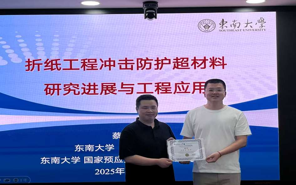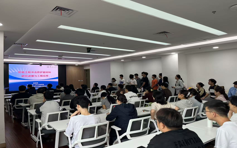 为促进学术交流,了解学术最新前沿动态。2025年9月23日上午,应我校曲政尧研究员的邀请,东南大学蔡建国教授来我校硅酸盐科学与先进建材全国重点实验室5楼会议室作报告。材料科学与工程学院,艺术设计学院与土木工程和建筑学院100多人参加。报告主题为:折纸工程冲击防护超材料研究进展与工程应用。硅酸盐科学与先进建材全国实验室曲政尧研究员,艺术设计学院王蕊老师和博士生吕澳主持会议。