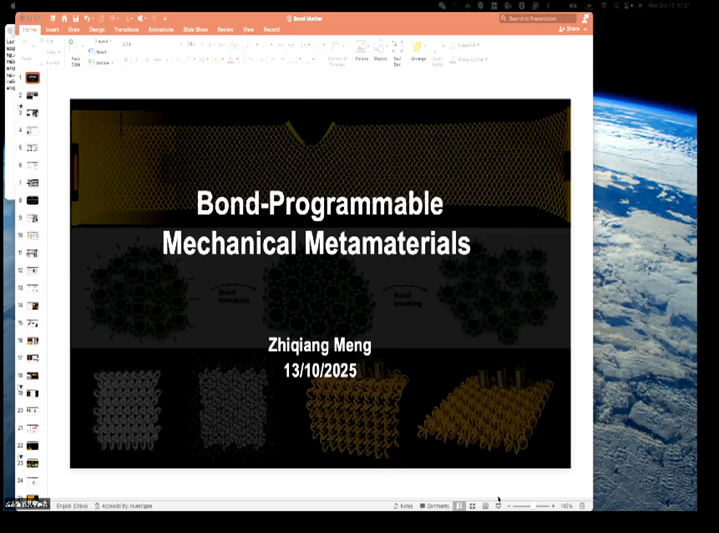 为促进学术交流,开拓学术视野,了解国内外专家学术研究新动态,受硅酸盐中心曲政尧研究员邀请,英国剑桥大学博士后研究员孟志强于2025年10月13日下午,在腾讯会议上作报告,报告主题为:双键断裂力学超材料全域增韧实现“无穷断裂韧性”。本次活动由硅酸盐中心、材料科学与工程学院联合举办,由曲政尧研究员,舒胜禹硕士主持会议,100余名师生代表参会。