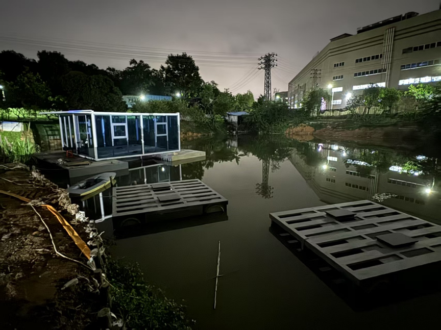 在中山市科技局的大力支持下,团队于2024年年底又研制出多功能组合式漂浮平台并成功下水,这一组漂浮平台包括文旅休闲平台、光伏发电(储电)平台等。这些平台的成功研发,不仅充分展示了水泥基材料在功能集成方面的显著优势,更为改善民众生活、推进乡村振兴提供了全新的模式。